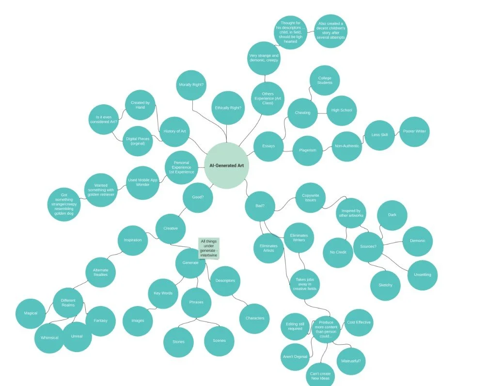 The first step in any writing process that is beneficial is creating a mind map or cluster (can be seen on the left). This can be very helpful to identify the potential subtopics of what you want to research more and base your article around. I put AI-generated art at my center than branched off with key words or potential topics and directions I could go. For me, I was really interest on gaining artist’s perspectives and whether they felt AI-generated art was a good or bad thing in the creative world.