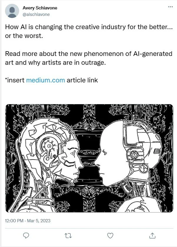 Nut Graf: The topic of AI-Generated Art is something that has been a particular interest of mine in the last few months. We all know that technology is always advancing, and we are closer now than ever to developing all kinds of Artificial Intelligence that can have human capabilities. There are a lot of moral and ethical questions about the content that has been generated and has raised debate on whether it should be considered artwork because it lacks originality and creativity (pulls from existing creations). This is an important topic for me to research and deliver because I am a creative person in general. I am in the advertising field, so it is important to be original and have storytelling skills when creating content.